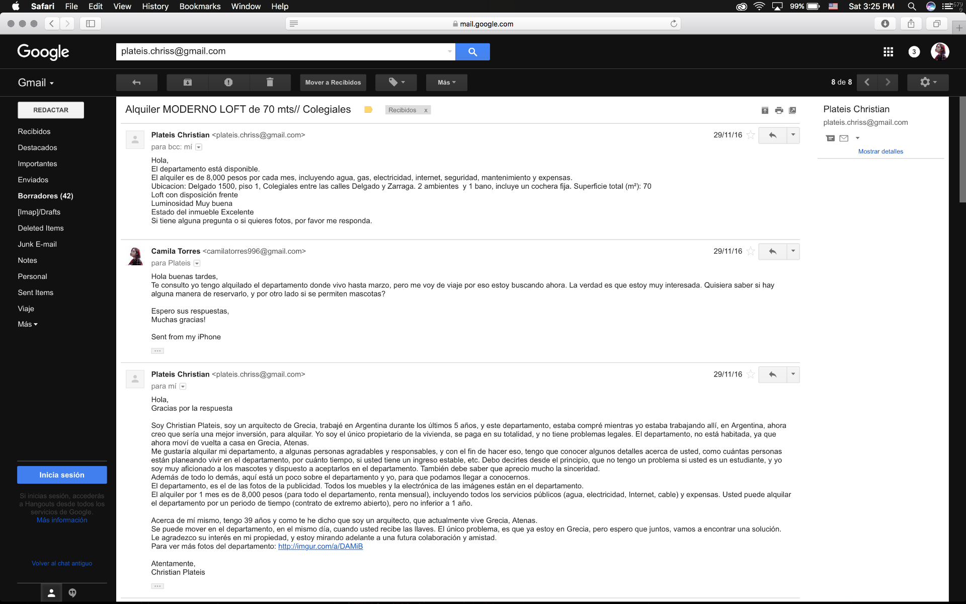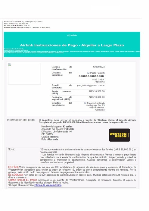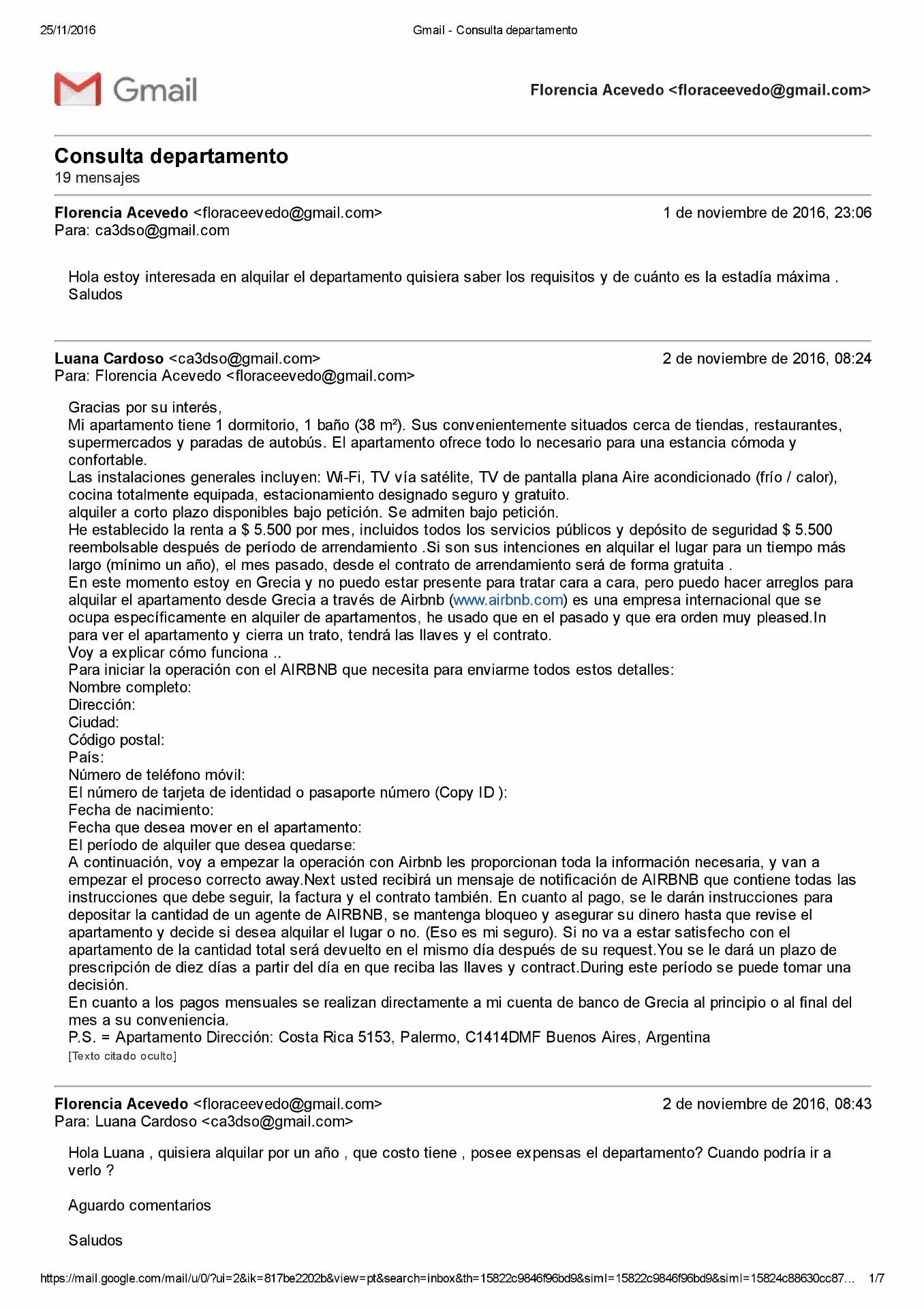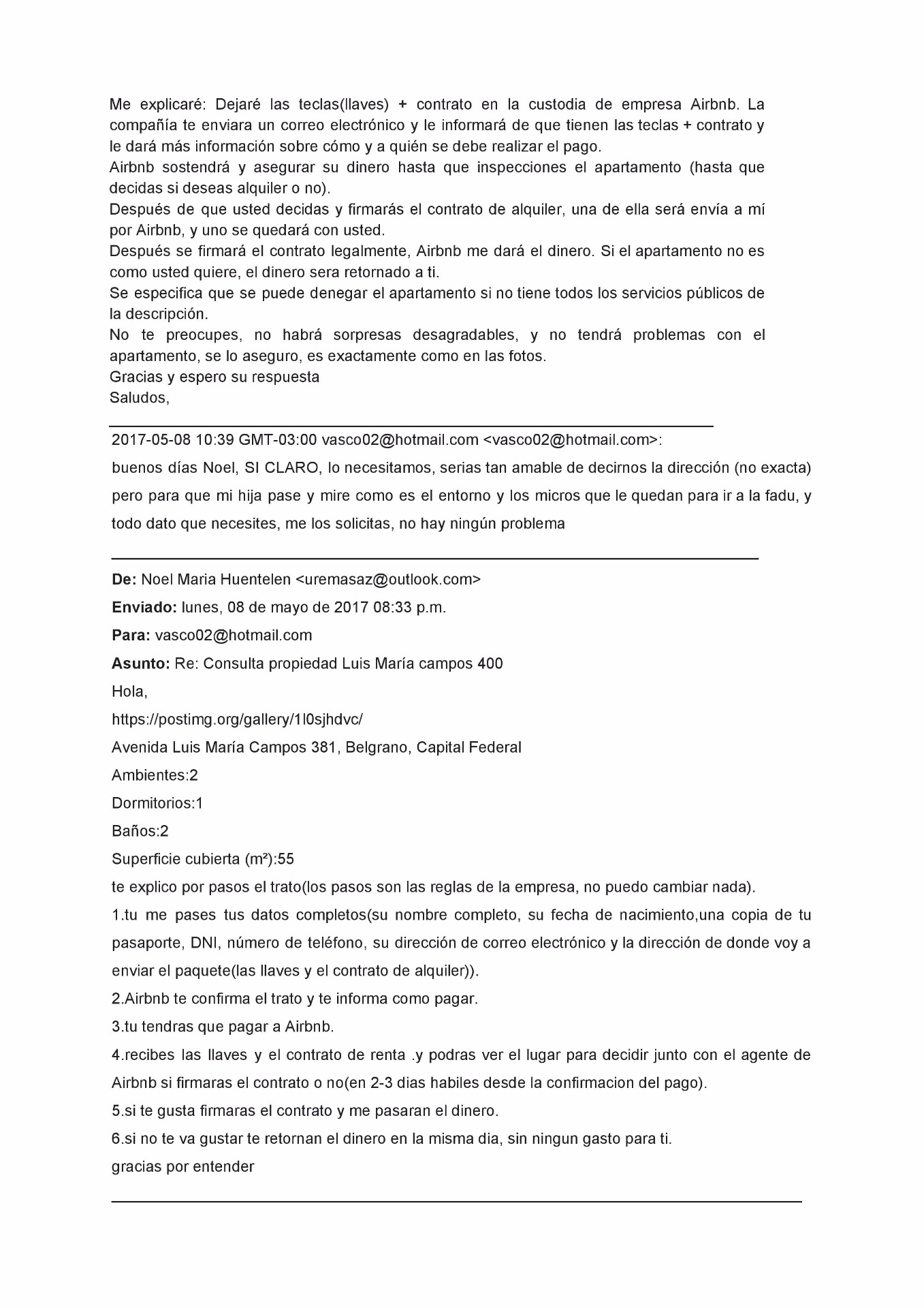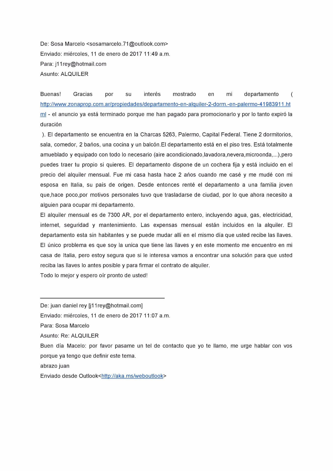 Camila Torres es residente de la Ciudad de Buenos Aires. Al buscar un departamento para alquilar en la página zonaprop.com se contactó con el supuesto dueño de un inmueble en el barrio de Colegiales, con quien continuó la comunicación vía mail.